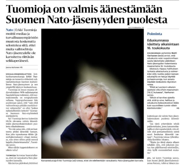 Toiseen Suomen entiseen emämaahan Ruotsiin Erkki luottaa. Hän tietää, että kansankoti Ruotsin kanssa toivoisimme mentävän yhtä jalkaa, mutta poliittinen tilanne Ruotsissa taitaa sopia huonosti nopeaan etenemiseen. Voi olla turha toivo, että Suomen Naton ulkopuolella jääminen johtaisi Ruotsin ja Suomen väliseen puolustusliittoon.