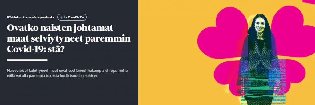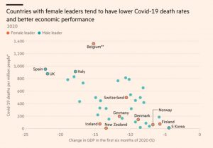 Nyt laajemmin ja paremmin perustein aiheesta oli artikkeli FT:ssa. Oheinen kuva havainnollistaa että naisten johtamat maat ovat pärjänneet hyvin.