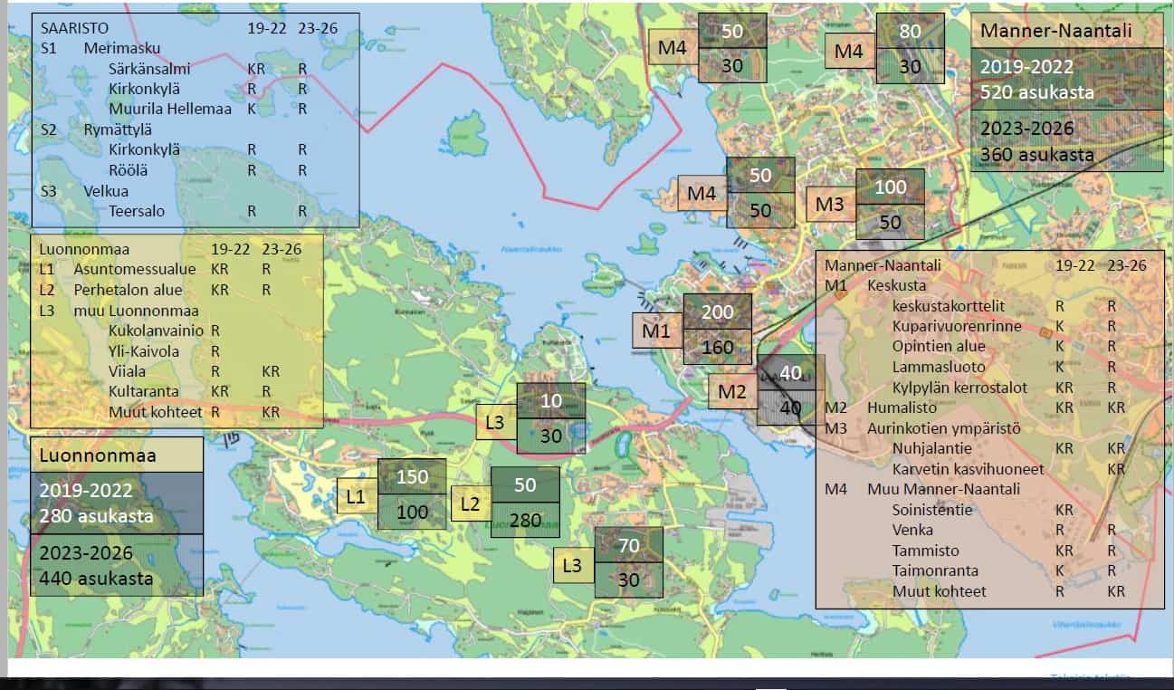 Tämä esityksen vuosille 2019-2022 Asuntoja tulisi mannerpuolelle 520, joista 200 keskusta-alueille ja Luonnonmaalle 280 asuntoa eli yhteensä 800 asuntoa eli 200 asuntoa vuodessa.