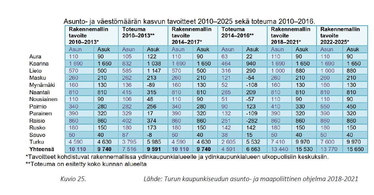 Samaan tulokseen johtaa myös kaupunkiseudun tarkastelu eli Naantalissa on kaudella toteutettu 700 asuntoa ja väestö on kasvanut 524 asukasta. Tavoite oli asuntoja ja asukkaita 1620 eli asukasmäärässä on päästy vain kolanteen osaan 32,3 prosenttiin.