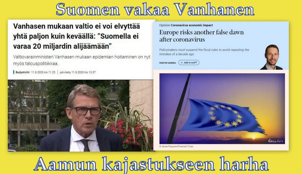 Epidemianhoito on tärkeintä talouspolitiikkaa. Se on elvyttävä eikä sisällä leikkauksia. Budjetti on 0,5 prosenttia elvyttävä EU:n tukipaketin kanssa. Erityisiä lisäelvytyksiä ei tehdä. Tärkein viesti on luottamuksen vahvistaminen: Kehysmenot pitkäjänteisesti ja luottamusta herättävästi; meidän kyky reagoida pitää hyvän ratingin tason. Sote-uudistus on tärkeä. Näkymä on sumuinen ja suurin varjo liittyy vientiin. Alijäämä 5-7 miljardia. Pitäydytään vielä 2,5 BKT kasvuennusteeseen, joka on hitaampaa kuin muissa maissa. Automaattiaisa säästöjä tehdään, mutta ei päätösperusteisia – kun on elvytyksen aikana ei tehdä leikkauksia.
