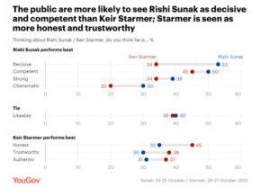 Nyt sitten arvioidaan tory Rishi Sunakin ja labor Keir Stramerin ominaisuuksia, kun pääministeri sopivuudessa johtajat ovat tasoissa, mutta puolueen työväenpuolue on reippaassa johdossa.