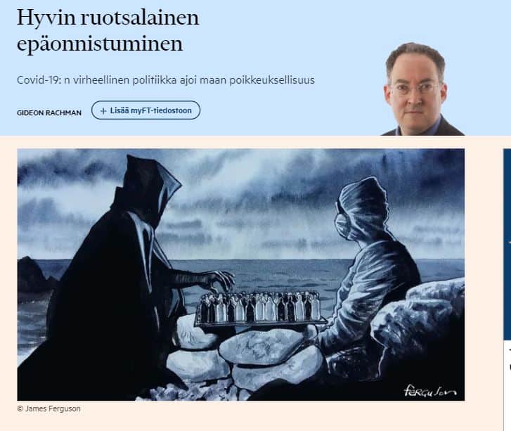 Hyvin ruotsalainen tapa epäonnistua otsikoi Gideon Rachman artikkelissan, jonka hän päättää: ilman ilkeämielisyyttä Covid-19: tapauksessa – kuten pakolaiskriisiäkin – joissa maa päätti seurata omaa polkuaan, pakottaa huomaamaan, että Ruotsin epäonnistumisen – jos se on sitä miltä näyttää – johdosta pitäisi olla aihetta enemmän suruun kuin vahingoniloon. (schadenfreude).
