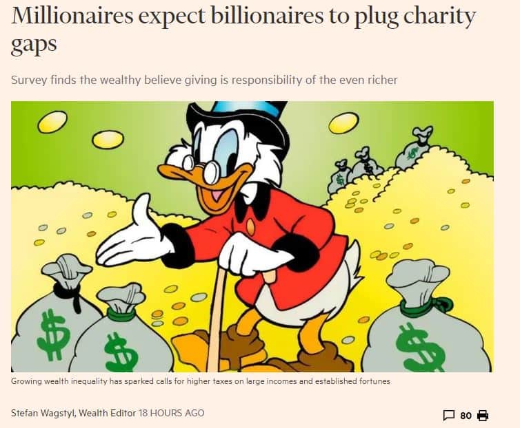 Barclays-pankin 400 monimiljonäärin yhdeksästä maasta (ei USA) tekemän haastattelututkimuksen, joka julkaistaan lauantaina, mukaan 75 prosenttia uskoi, että hyväntekeväisyys on itseään varakkaampien vastuulla.