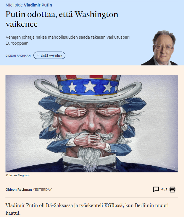 Näin hän kolumnissaan kirjoitti lähtökohdista, joiden hän arvelee vaikuttaneen Putinin toiveisiin, että USA:ssa tapahtuisi vaalien jälkeen samoin kuin Neuvostoliiton- johdolle – hetkellinen herpaantuminen.