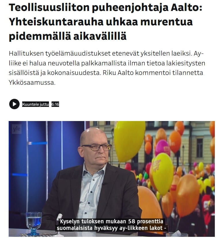 Toistaiseksi tilanteesta ulospääsyn etsijöitä on ollut harvassa, mutta Aallolla on ehdotus.– Ulospääsyn osalta hallitus voisi aloittaa sillä, että se ylipäänsä huomioisi esityksistä annetun lausuntopalautteen sekä oikeusoppineiden kritiikin heikosta lainvalmistelusta ja puutteellisista vaikutusarvioista. Ulospääsy voi löytyä myös tätä kautta, jos muutoksia ei halua tehdä ay-liittojen lakkojen vaikutuksesta.
