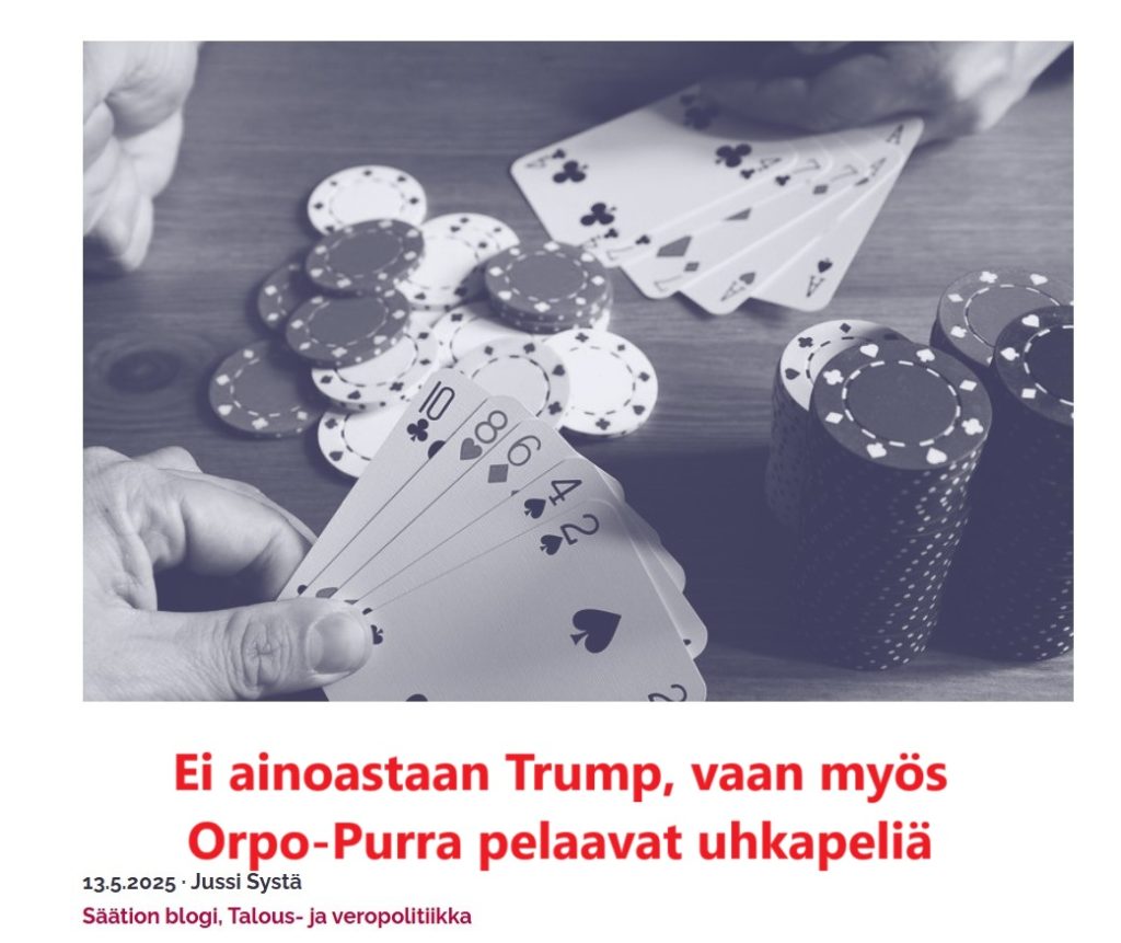 Petteri Orpon hallitus hylkäsi huhtikuun kehysriihessä tavoitteensa velkaantumisen taittamisesta. Julkisen talouden alijäämä kasvaa sen uusilla päätöksillä noin neljällä miljardilla eurolla vuoden 2029 tasolla. Seurauksena hallituksen tavoittelema yhdeksän miljardin euron sopeutus on kutistumassa puoleen miljardiin. Sen veronalennuksista hyötyvät olennaisesti vain yli 8 000 euroa kuukaudessa ansaitsevat – siis runsaat 100 000 huipputuloista. Talouspolitiikan asiantuntija Jussi Systä arvioi kirjoituksessaan, että hallitus pyrkii velkabluffillaan painostamaan seuraavan hallituksen leikkauslinjalle. Lue Systän blogikirjoitus täältä. Sorsa säätiön tiedote.
