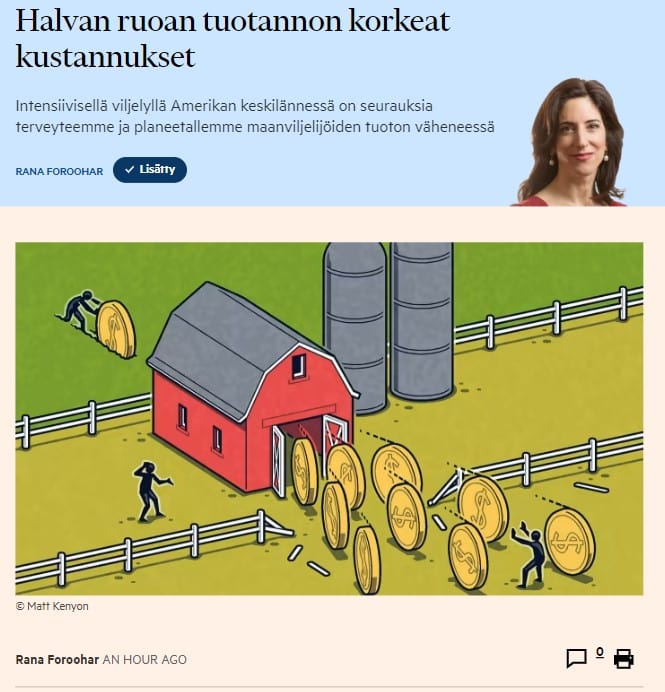 Nyt kun luin FT:n Rana Forooharin kirjoituksen erityisesti sen otsikon ja ajattelen nykyistä tilannetta ja hän kuvaus jenkkimaataloudesta, niin edelleen arvelen, että maatalous paiano sanalla talous on vaikea asia.