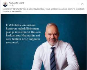 – Tieparannus on kerta kaikkiaan pakko toteuttaa. Sille ei ole vaihtoehtoja, paaluttaa Leppänen viitaten Suomen EU:lle antamaan sitoutumakseen Europan laajuisen ydintieverkon (TEN-T) saattamisesta kuntoon Suomen päässä vuoteen 2030 mennessä. Naantalin ja Raision välisen osuuden on odotettu olevan valmis toteutettavaksi vuonna 2025.”