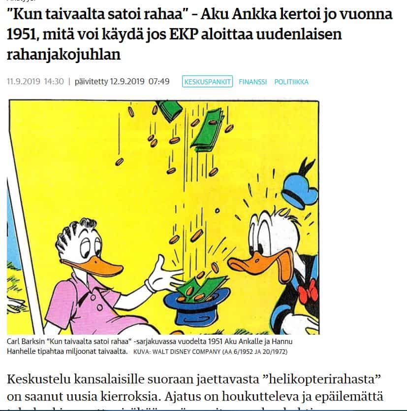 Kauppalehden analyysissä Janne Soisalon-Soininen keksi oivallisen vertauksen ja sai sillä varmaan suupielet hymyyn seurauksella, että ongelman ydin jäi huomaamatta: Talous ei kasva, inflaatio matelee ja riskien karttaminen on sijoittajien johtava tavoite, josta todisteena on nolla tai miinuskorkoisten sijoitusten suosio. Investointeja ei ole saatu käyntiin löysästä rahasta huolimatta eli rahan puutteesta ei ole kysymys. KL kertoo Aku / Roope asetelmalla miten holtittomassa rahan jakelussa kävi:
