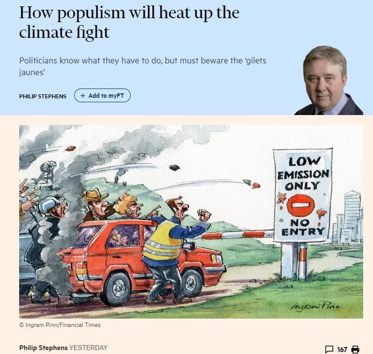 Tähän saumaan Suomessa Halla-aho /Holm voimakaksikko esittelivät oman ohjelmansa, jossa he kertovat samaa tarinaa, kuin mihin Philip Stephens yllä viittaa. He jopa poliittisesti erittelevät, että ilmastomuutoksen vaatimista veron korotuksista kärsivät enemmän Perussuomalaisten, Kokoomuksen, Keskustan ja SDP:n kannattajat sen sijaan vähemmän vihreät ja vasemmistoliittolaiset. Näin voi käydä, jos mitään korvaavaa ei tehdä. Ikävä vaan, että pelote toimii.