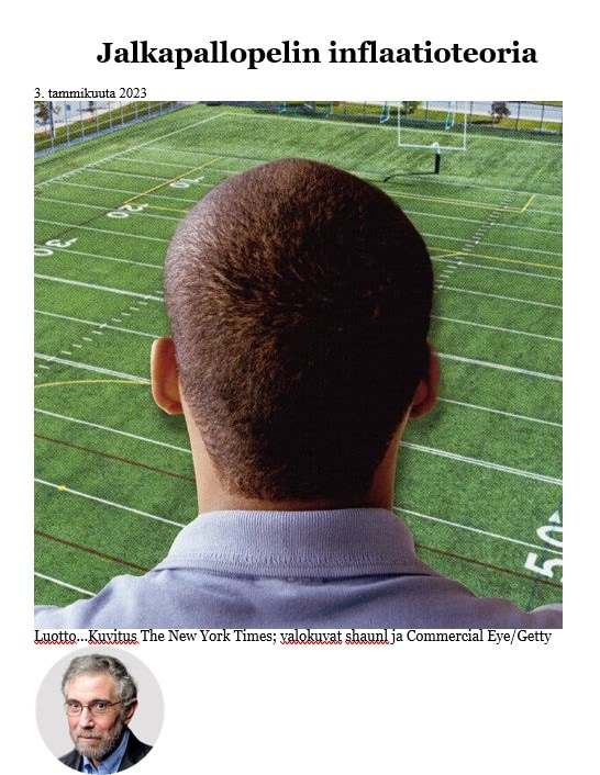Krugmanin pelikenttä on makrotalous eli valtion ainoa stadion, mutta inflaation maksaja eli kuluttaja eli palkansaaja tai yrittäjä on monenkin pelikentän katsomossa yhtäaikaa, muttei yhdessäkään vapaaehtoisesti pääsylippua ostaneena, fundeerasin.