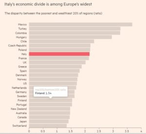 Alla olevassa diagrammissa nähdään, että Suomen alueista on rikkain viidennes 1,54 kertaa varakkaampi kuin esimerkiksi Italiassa  vastaava kerroin 2,18