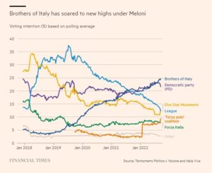 Se olisi Italian ensimmäinen äärioikeistolaisen hallinnon kokeilu fasistisen diktaattorin Benito Mussolinin jälkeen, yhteensä 69 ideologisesti erilaisen hallituksen jälkeen toisen maailmansodan jälkeen. Monet italialaiset pelkäävät, että henkilökohtaisia ​​vapauksia rajoitetaan ja tilaa demokratialle pienennetään. Toiset ovat huolissaan siitä, että suhteellisen kokemattomalta Italian veljekseltä, jonka ennustetaan johtavan koalitiota, ei ole teknistä pätevyyttä navigoida Italiaa sen nykyisten taloudellisten haasteiden läpi. FT 22.9.2022