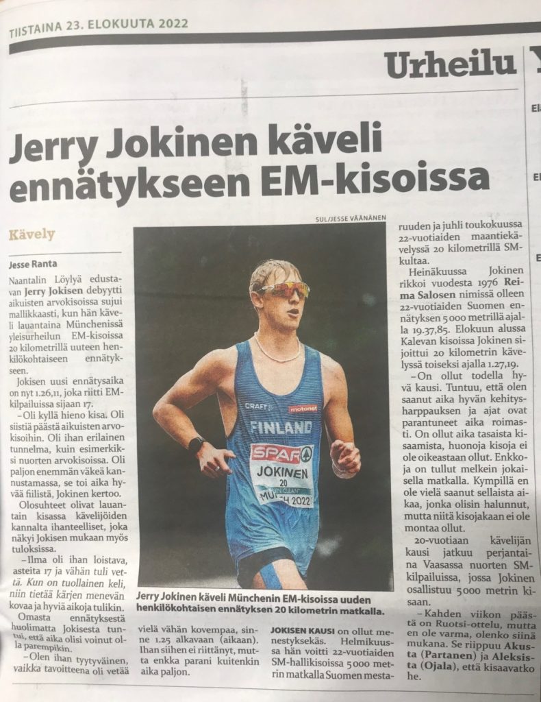 Vielä hänestä kuulaan, mutta jo nyt Jesse kuulu urheilijoihin, jotka itsensä ylittivät itsensä ja toisenlaisissa olosuhteissa suoritus oli saanut enemmän ansaitsemaansa huomiota. Onnea jo tästä kovasta suorituksesta Jesselle – Uskon, että vielä Naantalissakin juhlitaan ! Kiitos myös Vakka-Suomen Sanomille Jessen suorituksen uutisoinnista. Oheinen kuvakaappaus lehdestä