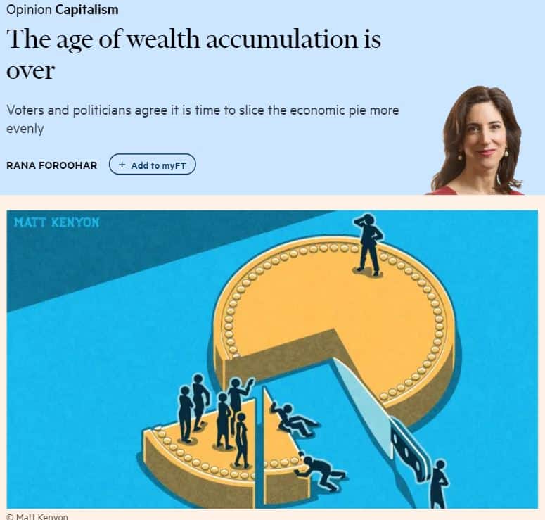 Nähtäväksi jää milloin ja missä muodossa veronkorotukset tapahtuvat. Mutta varallisuuden jakautumisen aikakausi on loppumassa ja sillä on merkittäviä vaikutuksia sijoittamiseen. Yhdysvaltain osakkeiden arvo on todennäköisesti saavuttanut huippunsa, ja aineelliset varat, kuten kulta, muut hyödykkeet, asuminen, jopa taide – mikä tahansa kiinteässä muodossa oleva – voivat hyötyä suhteessa monikansallisten yritysten omaan pääomaan ja velkaan.