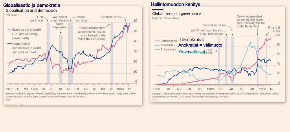 Martin Wolf pohtii suuria trendejä. Nyt kapitalismin sotkuinen liitto on pöydällä. Hän uskoo kuvan voimaan ja muistuttaa aian, että niiden todistusvoima ei ole aukoton. Mutta ei niitä voi ohittakaan. Globalisaation ja demokratian yhteys on ollut ilmeinen ainakin laskettaessa demokraattisten valtioiden suhteellisella kehityksellä. Hallintomuotojen esiintymissuhteet vaihtelevat ymmärrettävästi: Kun Neuovostoliitto hajosi poidtui diktatuuri ja tilalle tuli sekasotku.