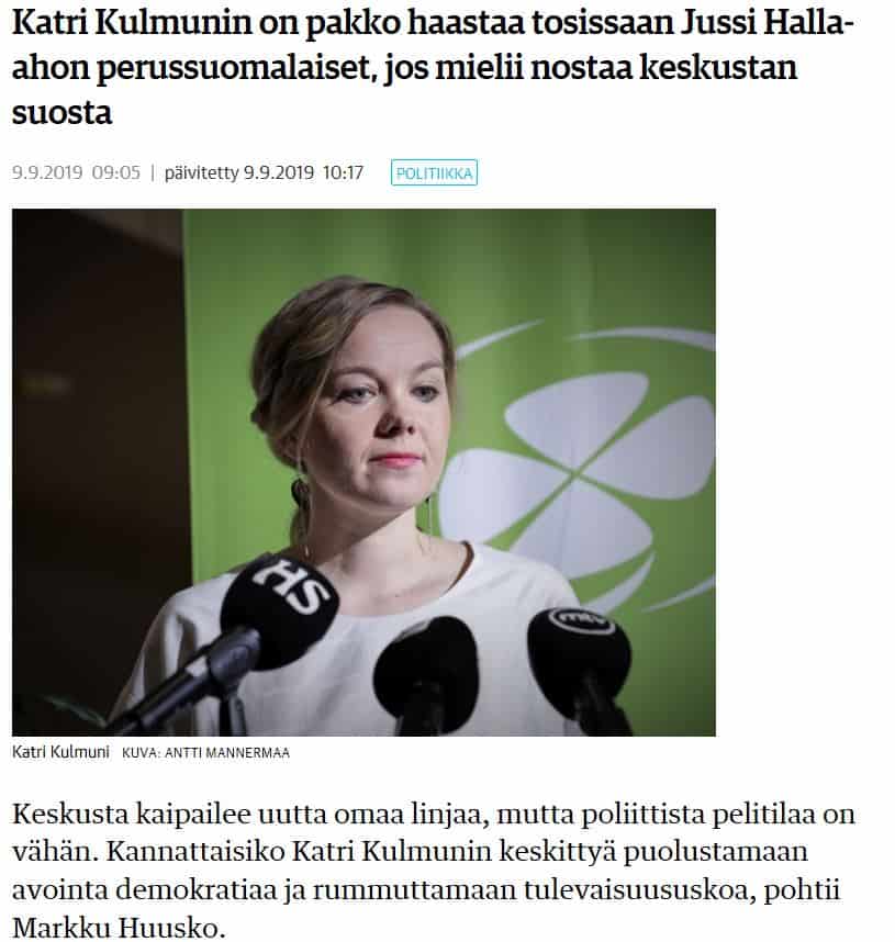 Perussuomalaiset keskustan on nyt joka tapauksessa haastettava ja pantava sen johtajat vastaamaan sanoistaan, jos perinteinen valtapuolue mielii kannatusta lisää. Olisiko paras keino avoimen demokratian vahva puolustaminen ja tulevaisuususkon rummutus, eräänlainen ääripositiivisuus? Voisiko se myydä 2020-luvun alun Suomessa?