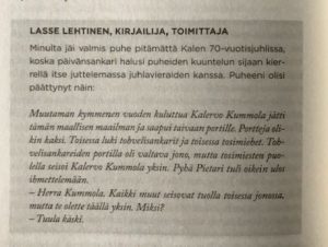 Viimeinen lainaus kirjassa on Lasse Lehtisen pitämätön syntypäivä puheen loppu: