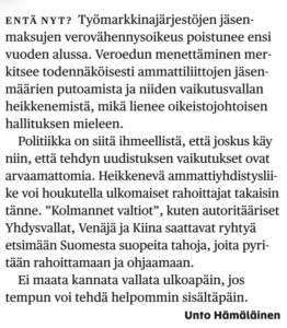 Unto Hämäläisen perässähiihtäjä artikkeli Hesari kuukausiliitteessä on taas kerran historiallisesti mielenkiintoinen sinänsä, mutta johtopäätöksiltään viisas. Kannattaisiko miettiä syitä ja seurauksia, nähdä vähän pidemmälle tai paremmin syvemmälle.