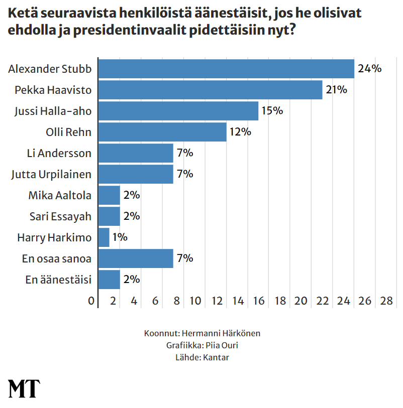 Maaseudun Tulevaisuuden presidenttikyselyssä eniten kannatusta saa kokoomuksen presidenttiehdokas Alexander Stubb. Hänen kannatuksensa on 24 prosenttia. Kannoilla oleva valitsijayhdistyksen ehdokas ja vihreiden tukema Pekka Haavisto kerää 21 prosentin kannatuksen.