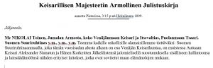 Me NIKOLAI Toinen, Jumalan Armosta, koko Venäjänmaan Keisari ja Itsevaltias, Puolanmaan Tsaari. Suomen Suuriruhtinas y.m., y.m., y.m. Teemme kaikille uskollisille alamaisillemme tiettäväksi: Suomen Suuriruhtinaanmaalla, joka tämän vuosisadan alusta alkaen on osa Venäjän Keisarikuntaa, on muistossa Autuaan Keisari Aleksander Siunatun ja Hänen Korkeitten Jälkeläistensä jalomielisellä suostumuksella sisälliseen hallintoonsa ja lainsäädäntöönsä nähden erityiset laitokset, jotka ovat sovitetut maan elämänolojen mukaan.