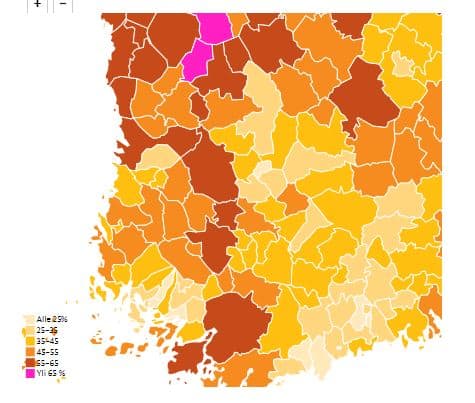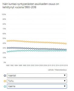 Oheisessa kuvassa on nähtävissä lounaisen Suomen kuntien syntyperäisten osuus väritetyssä kuvassa. Näyttäisi siltä, että elinvoimisuutta on enemmän vaaleilla alueilla.