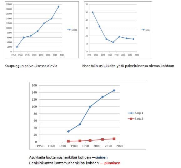 1950 luvulla oli yksi kaupungin palveluksessa oleva 50 asukasta kohden, nyt heitä on 17 asukasta kohden. Suhdeluku