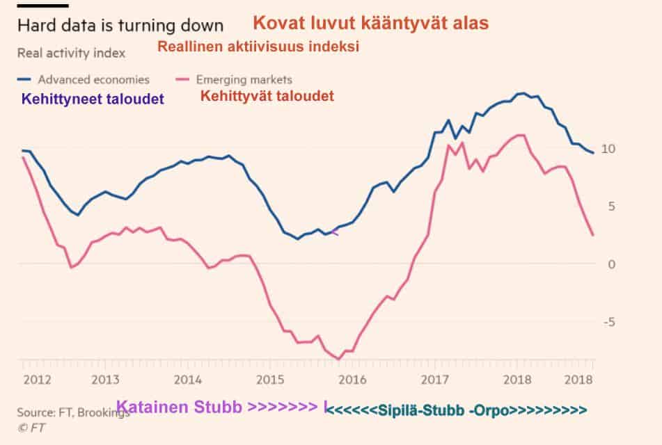 vaikka Suomen ja USA:n tilanteita ei pidä vertailla siksi, että USA vaikuttaa maailman talouteen ja me emme. Eli maailman talouden vaikutukset ovat Suomelle ulkoisia tekijöitä. Kun reaalisen talouden indeksin muutoksia seuraa, voi sanoa, että taloudellisessa mielessä monella tavalla tyrinyt Sipilän hallitus on ollut Hannu Hanhi, koska sen ajalle on maailman talouden kasvun hetket ovat sattuneet.