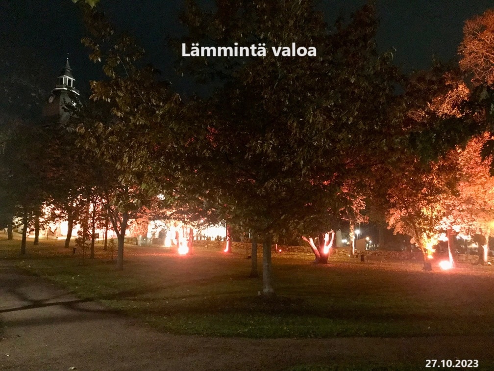 Kirkkopuiston kaunis valaistus todistaa valon vaikutusta; se sai ihmiset liikkeelle ja voi olla, että Föri baarillekin tuli kannattava ilta.Siis valolla saadaan monenlaista positiivista.