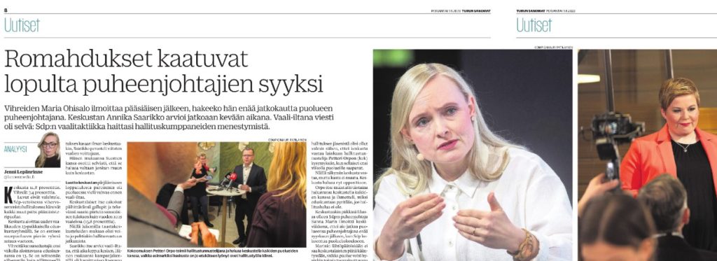 TS 7.4.2023 Jenni Leppärinne kirjoittaa artikkelissaan ”Romahdukset kaatuvat lopulta puheenjohtajien syyksi” Keskustan tappiosta näin: