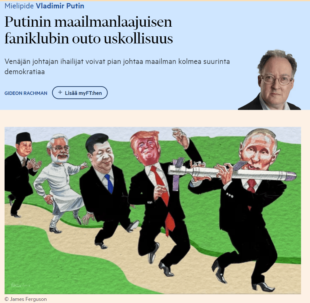 On todellakin täysin mahdollista, että maailman kolme suurinta demokratiaa – Intia, Yhdysvallat ja Indonesia – valitsevat kaikki Putinin ihailijat johtajikseen tänä vuonna. Indonesialainen Prabowo Subianto, intialainen Narendra Modi ja yhdysvaltalainen Donald Trump ovat kaikki huomionarvoisia Putinin kansainvälisestä tuomitsemisesta – syistä, jotka menevät reaalipolitiikkaa pidemmälle