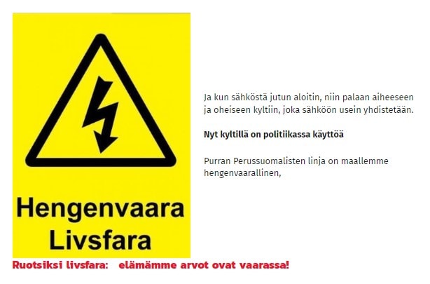 Tämä on Suomelle hengenvaarallista, kuin myöskin korkeajännitteen kanssa leikkiminen suomalaiselle.