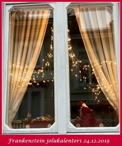 Ja sitten havainto Mannerheiminkadulla Kristiinankadun risteyksen jälkeen. 90 prosenttia väestä näkee ahkeran Nevarin Henkan putiikin ikkunan, mutta ani harva huomaa Frankensteinin joulukalenteri-ikkunat. Kaupallisuus on joulun vahvin sanoma, sanotaan mitä sanotaan.