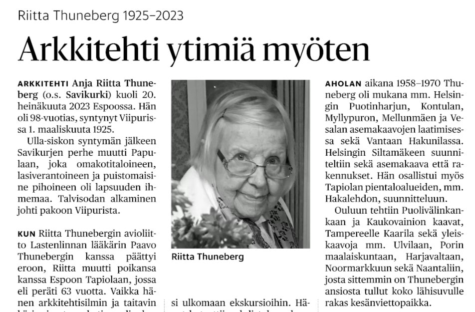 Riitta Thuneberg oli, kuten muistokirjoituksessa todetaan, ytimiään myöten arkkitehti. Hän ymmärsi kulttuurihistoriaa ja Naantalia niin, että monien vuosien aikana on ilo nähdä hänet kujillamme. Työkohteesta oli tullut hänelle läheinen.