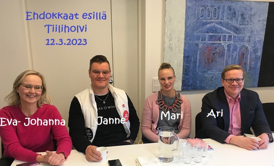 Tiiliholvissa oli mahdollisuus kuulla ja haastatella viittä ehdokasta: Eeva Johanna Eloranta, Janne Laulumaa, Mari Lahti , Ari Korhonen ja Maaret Laakso ( auto ongelmien takia puuttuu kuvasta)