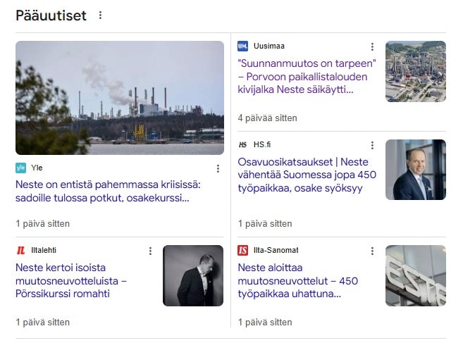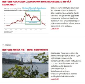 Olen näille sivuille kirjoittanut kymmeniä juttuja, joka löytyvät hakusanalla Neste. Kannattaa perehtyä, jos haluaa yhtiön historian viimeaikaisia käänteitä ja niiden tapahtuma aikoja muistella. Kuvakaappauksessa kaksi viimeisintä.