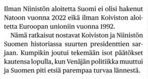 Poliittisten toimittajien priimus Unto Hämäläinen kirjoitti Hesarin kuukausiliitteeseen arvionsa Sauli Niinistöstä. Jutun lopuksi hän arvioi, että kirjoittava Sauli tulee kertomaan oman näkemyksensä Koiviston tyyliin; tätä se oli tältä toivon sen näyttävän.