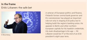 Financial Timesissä on pitkä ja monipuolinen artikkeli Euroopan Keskuspankin tulevaisuudesta. Marion Dragin seuraajasta on valettu kannuja jo vuosia . Tahti kiihtyy ja kun h-hetki kesällä lähestyy. Sitä ennen pidetään Euroopan Parlamentin vaalit ja Suomessa myös eduskuntavaalit.