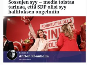 Antton Rönnholmin kolumnissa on näkemys siitä, mitä tarinaa on Kokoomus yrittänyt tarjota selitykseksi, että hallituksen murheet olisivat SDP:n syy siksi, että se ei tullut hallitukseen, johon sitä ei pyydettykään.