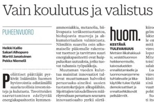 Oheinen kuvakaappaus kertoo kokeneiden ja tieteissä ansioituneiden ja bisneksessä pärjänneiden huolen ympäristön uhasta ja Suomen suistumisesta raaka-aineiden luovuttajaksi. Koulutuksen ja valistuksen puolesta puhujia ei ole liikaa!