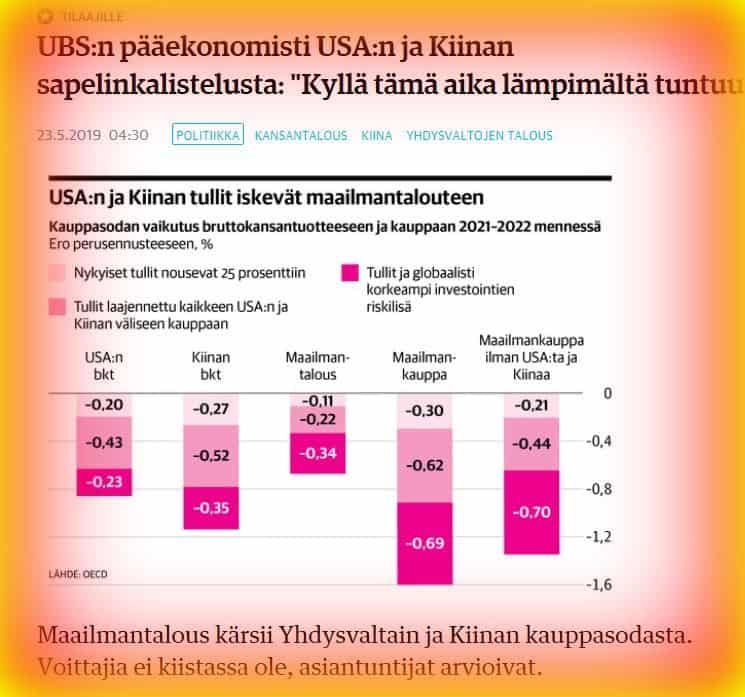 ”Jos tämä eskaloituu huippuunsa, niin meidän laskelmiemme mukaan Yhdysvaltain talouskasvu hidastuu ensi vuonna 1,5 prosenttiin ja Kiinan noin 5,5 prosenttiin.”Samalla hidastuu koko maailman talouskasvu.