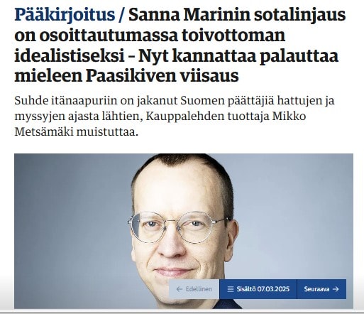 Niin on sanottu ja opiksikin on otettu pakon edessä. Mutta kyllä se jotenkin kovasti tunnepuolelle särähti tuo Kauppalehden päätoimittajan kirjoitus, jossa Suomen nykyisen ”sotapolitiikasta” syytteeseen pannan Sanna Marin.
