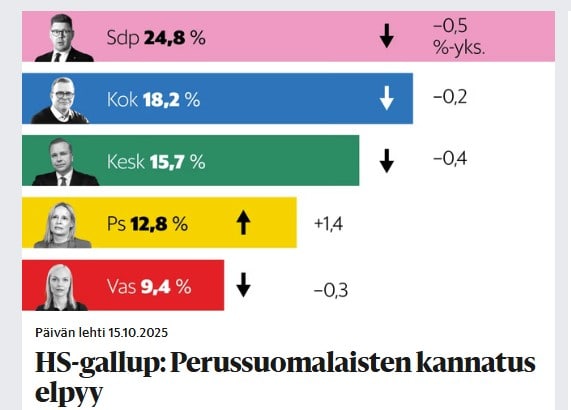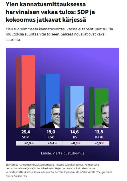 Näin Hesari tulkitsee: Muutokset marraskuun kannatusgallupissa ovat pieniä. Perussuomalaisten kannatus on kohentunut lokakuusta 0,6 prosenttiyksikköä. Oppositiopuolue keskustan suosio on puolestaan heikentynyt 0,4 prosenttiyksikköä. Muut muutokset ovat pienempiä. Kaikki muutokset mahtuvat tutkimuksen…