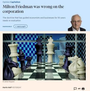 Pitkään, englantia puhuvissa maissa ja yhä useammin muualla vallitsi näkemys, jonka ekonomisti Milton Friedman esitti 50 vuotta sitten syyskuussa 1970 julkaistussa New York Times -lehden artikkelissa ” Yritysten sosiaalinen vastuu on kasvattaa voittojaan ”.