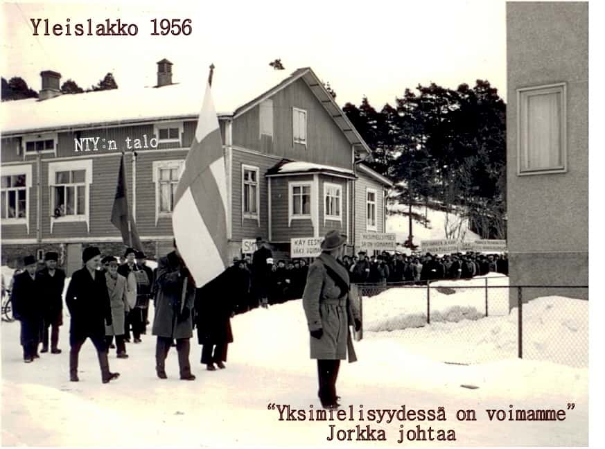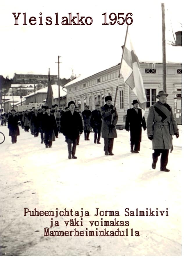 Kulkue on lähdössä Työväentalolta marssille. Joukkoja johtaa