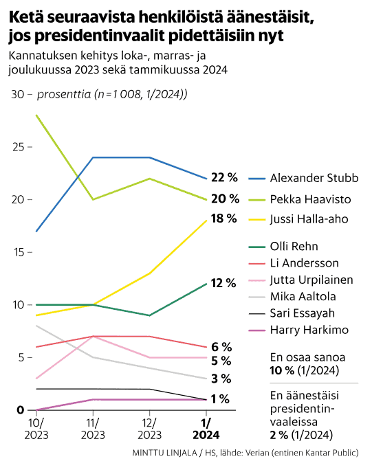 Syy voi olla osin Urpilaisen oma, sillä hän vaikutti haluttomalta lähtemään komissaarin paikalta vaalitaistoon. Mutta Urpilaisen matala kannatus kertoo myös isosta muutoksesta. Presidentti Tarja Halosen teemojen uudelleenlämmitys ei tässä ajassa pure. HS pääkirjoitus 23.1.2024