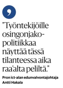 NTY on tehnyt ja olen puolestani pitänyt useassa yhteydessä ääntä potkuoptioiden puolesta. Eli että irtisanotuille olisi myöhemmin oikeus optio ostaa yhtiön osakkeita irtisanomishetken pörssikurssilla. Tämä voisi vähentää intoa ja joka tapauksessa se olis pieni korvaus niille henkilöille, joiden ansiosta yritetään tehdä parempaa tulosta.