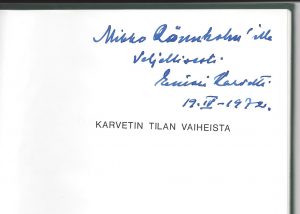 Myöhemmin kerromme mekin versiomme omassa lehdessämme. Karvetit eivät tästä tykänneet. Kun sitten muistutin Oriston jutusta sovimme tämän ja jatkoin Einari Karvetin kanssa yhteisiä harrastuksia, keskusteluja yhteiskunnallisista asioista. Sain häneltä Karvetin suvulle tarkoitetun kirjan Karvetin tilan vaiheista saatteella, että kun olet tilan kohtaloon merkittävästi vaikuttanut.