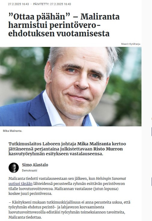 Demokraatti uutisoi, että Mika Malirantaa ottaa päähän